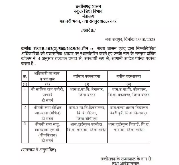 साथ ही, रूपा दीक्षित (व्याख्याता, टी संवर्ग, शासकीय उच्च माध्यमिक विद्यालय टिकराकला, विखं गौरेला जिला जीपीएम) को शासकीय कन्या आश्रम विद्यालय देवरीखुर्द, जिला बिलासपुर भेजा गया है। वहीं, रूना साहू (व्याख्याता एलबी, शासकीय हाईस्कूल परसोदा, विखं चारामा, जिला कांकेर) का स्थानांतरण शासकीय हाईस्कूल भिलाई, विखं चारामा, जिला कांकेर में किया गया है।