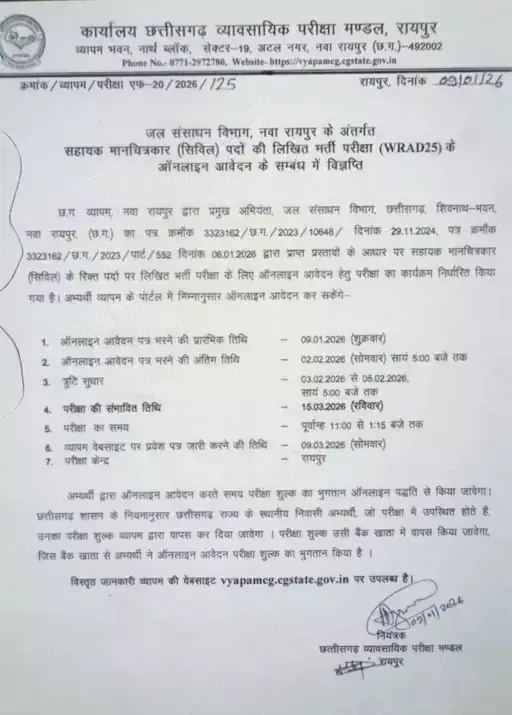 CG Vyapam 2026 : जल संसाधन विभाग में सहायक मानचित्रकार के पदों के लिए नोटिफिकेशन जारी, 2 फरवरी तक करें ऑनलाइन आवेदन