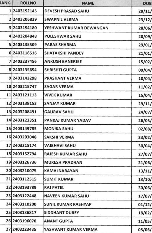 इस साल टॉप-10 में 8 लड़कों और 2 लड़कियों ने जगह बनाई है। सूची में शामिल अभ्यर्थियों में स्वप्निल वर्मा, यशवंत देवांगन, पोलेश्वर साहू, पारस शर्मा, संस्कृति पांडेय, अंकुश बनर्जी, सृष्टि गुप्ता, प्रशांत वर्मा और सागर वर्मा शामिल हैं।