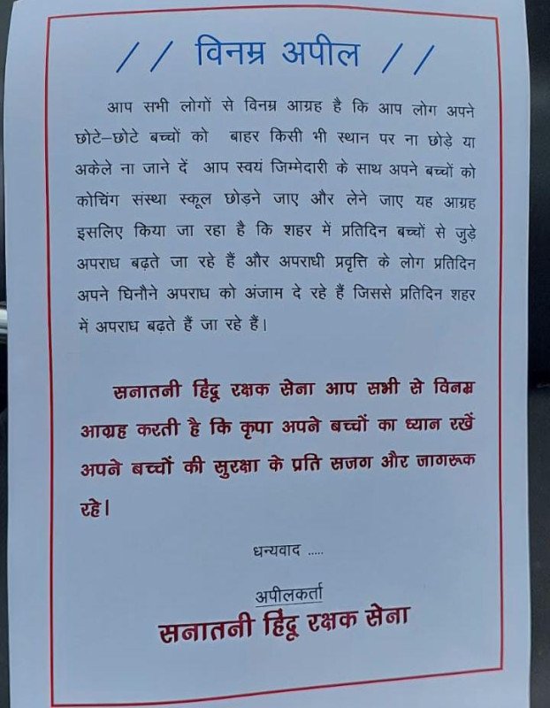 बच्ची से दुष्कर्म के बाद हत्या से सहमा शहर, सनातनी हिंदू रक्षक सेवा ने चलाया जागरूकता अभियान