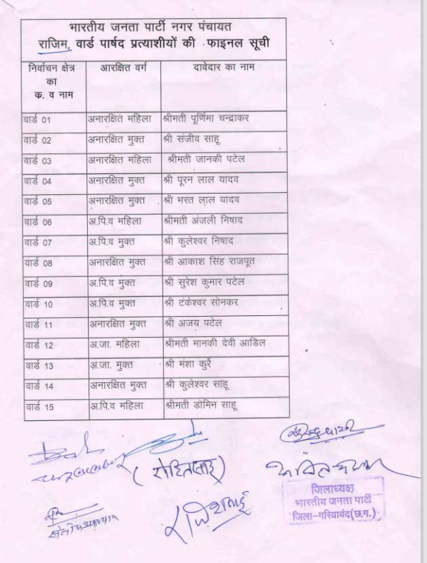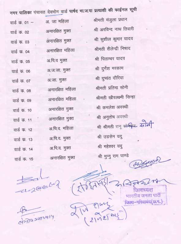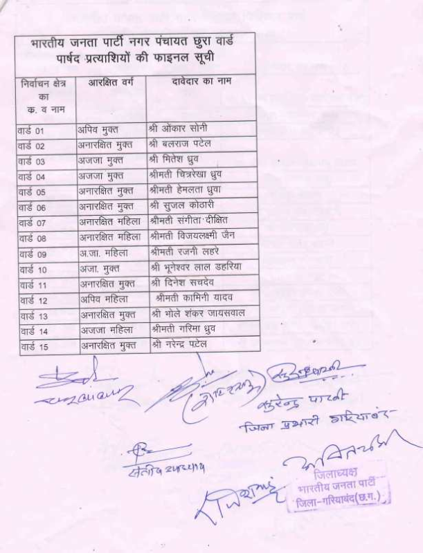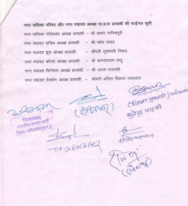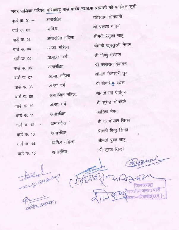 Civic Elections 2025 : गरियाबंद में भाजपा ने की प्रत्याशियों की घोषणा, नगर पालिका और 5 नगर पंचायतों के अध्यक्ष उम्मीदवारों के नाम तय
