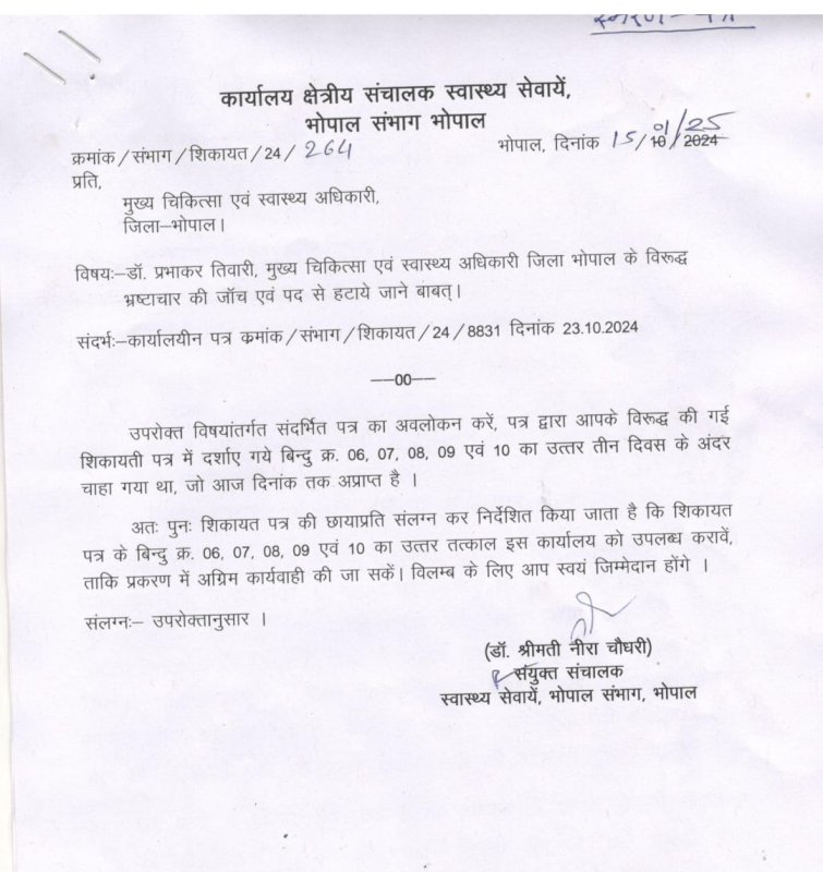 MP News : रवि परमार ने कहा कि गौरतलब है कि यह पत्र मध्यप्रदेश शासन के पूर्व स्वास्थ्य मंत्री प्रभुराम चौधरी की पत्नी एवं संयुक्त संचालक स्वास्थ्य सेवाएं, भोपाल संभाग, डॉ. नीरा चौधरी द्वारा जारी किया गया है। इससे यह संदेह उत्पन्न होता है कि कहीं किसी प्रकार का राजनीतिक दबाव तो नहीं बनाया जा रहा? आखिर क्या मजबूरी है कि शिकायतकर्ता की मांग के अनुरूप निष्पक्ष जांच के बजाय आरोपी अधिकारी से ही जवाब मांगा जा रहा है ?