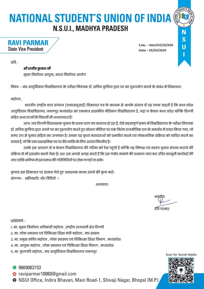 भोपाल। भारतीय राष्ट्रीय छात्र संगठन (NSUI) ने मध्य प्रदेश आयुर्विज्ञान विश्वविद्यालय , जबलपुर के परीक्षा नियंत्रक डॉ. सचिन कुचिया के खिलाफ चुनाव आचार संहिता उल्लंघन की शिकायत भारत निर्वाचन आयोग के मुख्य निर्वाचन आयुक्त राजीव सिंह को की है। शिकायत में आरोप लगाया गया है कि डॉ. कुचिया ने अपने पद का दुरुपयोग करते हुए सोशल मीडिया पर एक विशेष राजनीतिक दल के पक्ष में प्रचार किया, जो कि स्पष्ट रूप से लोकतांत्रिक प्रक्रिया को प्रभावित करने का प्रयास है।