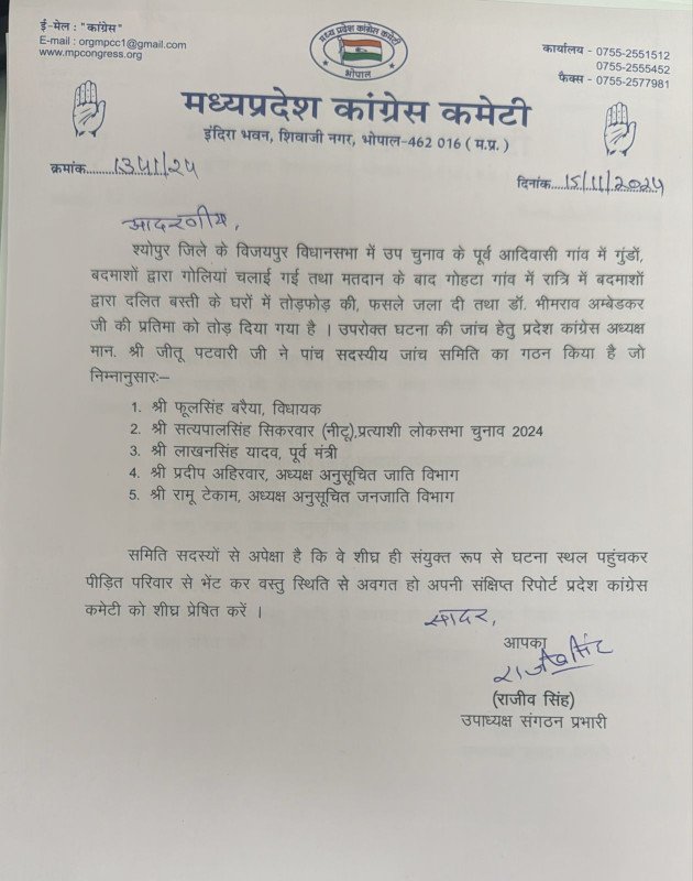 विजयपुर उपचुनाव में आदिवासियों पर हुए अत्याचार को लेकर कांग्रेस ने बनाई जांच समिति