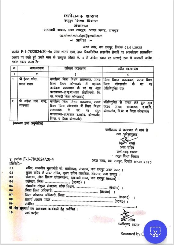 Education Department Transfer : रायपुर। छत्तीसगढ़ शिक्षा विभाग ने प्रशासनिक आधार पर विभिन्न पदों पर ट्रांसफर किए हैं। इस बदलाव में एक तरफ जहां एक व्याख्याता की मिशन समन्वयक के पद पर प्रतिनियुक्ति समाप्त कर उन्हें फिर से स्कूल भेजा गया है, वहीं दूसरी तरफ प्रधान पाठक को सहायक कार्यक्रम समन्वयक से प्रतिनियुक्ति पर लेकर जिला मिशन समन्वयक बनाया गया है। शिक्षा विभाग के इस प्रशासनिक आदेश से कर्मचारियों के कार्य क्षेत्र में परिवर्तन आया है, और यह बदलाव स्कूलों में बेहतर कार्यप्रणाली और समन्वयन के उद्देश्य से किया गया है।