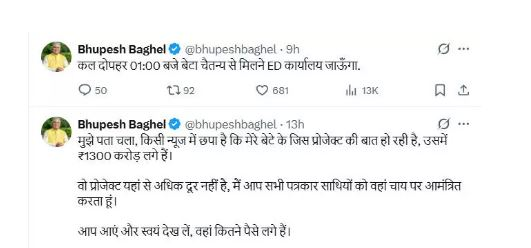 बता दें कि, चैतन्य की गिरफ्तारी और पूर्व सीएम भूपेश बघेल के भिलाई स्थित घर पर ED द्वारा की गई कार्रवाई के विरोध में प्रदर्शन लगातार जारी है। इसी कड़ी में कांग्रेस 22 जुलाई को बड़ा प्रदर्शन करने जा रही है। पूर्व सीएम भूपेश बघेल ने सोशल मीडिया प्लेटफॉर्म एक्स पर पोस्ट करते हुए लिखा है कि, दोपहर 01:00 बजे बेटे चैतन्य से मिलने ED कार्यालय जाऊँगा।