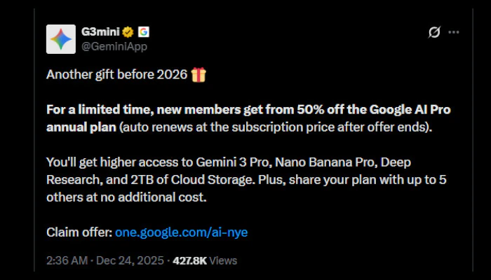 Google: नई दिल्ली। गूगल ने नए साल 2026 की शुरुआत से पहले यूजर्स को बड़ा तोहफा दिया है। कंपनी ने चुनिंदा क्षेत्रों में नए सब्सक्राइबर्स के लिए Google AI Pro और Google One के सालाना प्लान पर 50 प्रतिशत की भारी छूट की घोषणा की है। यह लिमिटेड टाइम ऑफर है, जो नए यूजर्स को आकर्षक AI फीचर्स और क्लाउड स्टोरेज कम कीमत में उपलब्ध करा रहा है।