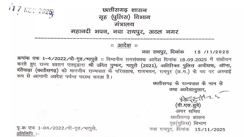 Governor’s ADC : रायपुर: राज्यपाल के नए परिसहाय की खोज अब समाप्त हो गई है। राज्य सरकार ने 2021 बैच के आईपीएस अधिकारी उदित पुष्कर को राज्यपाल का नया परिसहाय (ADC) नियुक्त करने का आदेश जारी कर दिया है। वे अब सुनील शर्मा की जगह यह अहम जिम्मेदारी निभाएँगे।