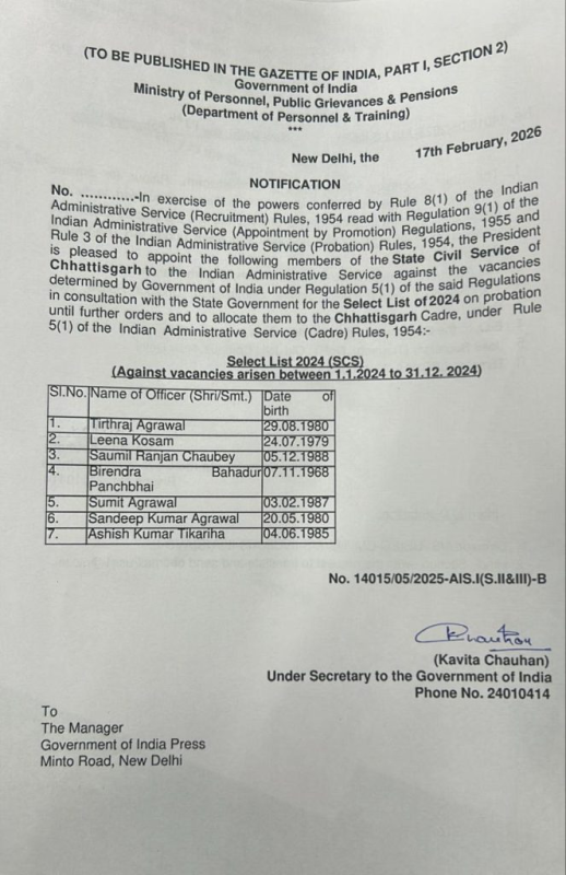 IAS AWARD 2024 : छत्तीसगढ़ के 7 राज्य सेवा अफसर बने IAS, केंद्र ने जारी की अधिसूचना