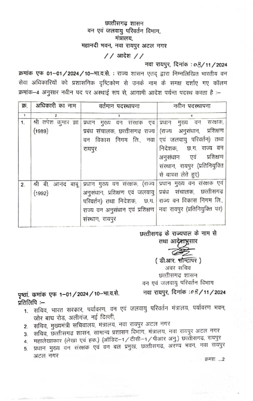 राज्य शासन ने दो आईएफएस (भारतीय वन सेवा) अधिकारियों के प्रभार में बदलाव किया है।