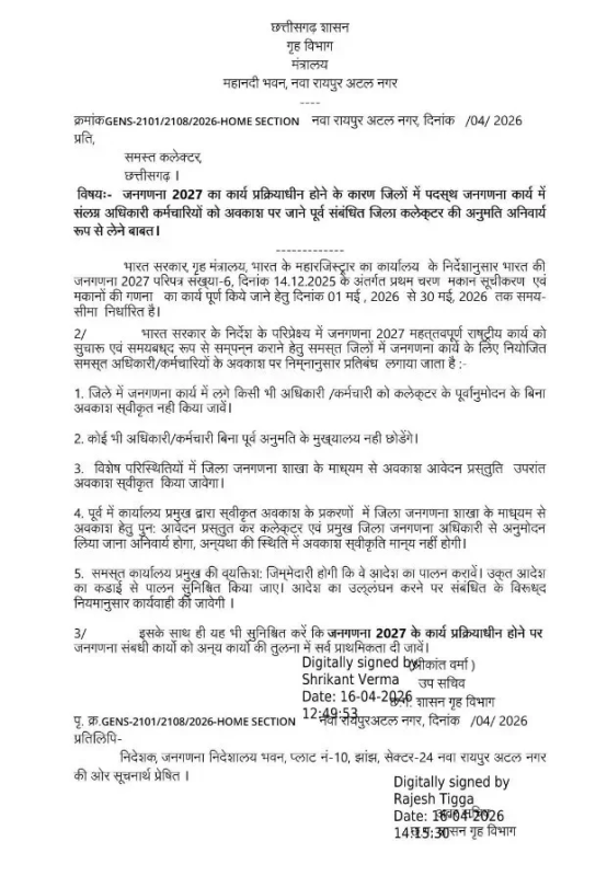 CG News : रायपुर: छत्तीसगढ़ सरकार ने जनगणना 2027 के पहले चरण को समय पर पूरा करने के लिए प्रशासनिक स्तर पर बड़ी सख्ती कर दी है। अब राज्य के किसी भी जिले में अधिकारी या कर्मचारी बिना जिला कलेक्टर की लिखित अनुमति के अवकाश नहीं ले सकेंगे। यह फैसला जनगणना कार्य की समयबद्धता और डेटा संग्रह की शुद्धता सुनिश्चित करने के लिए लिया गया है।