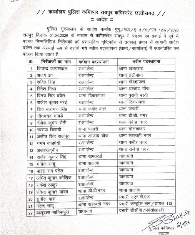 जारी आदेश के मुताबिक, आर.ए. केंद्र में पदस्थ जितेंद्र जायसवाल को खमतराई थाना, अजय झा को तेलीबांधा और शक्ति सिंह को मौदहापारा थाना भेजा गया है। वहीं रितेश मिश्रा को आजाद चौक थाने की जिम्मेदारी सौंपी गई है। टिकरापारा थाना में पदस्थ विनय सिंह बघेल को पुरानी बस्ती स्थानांतरित किया गया है, जबकि राजेश कुमार मर्दे को टिकरापारा थाना का नया प्रभारी बनाया गया है।