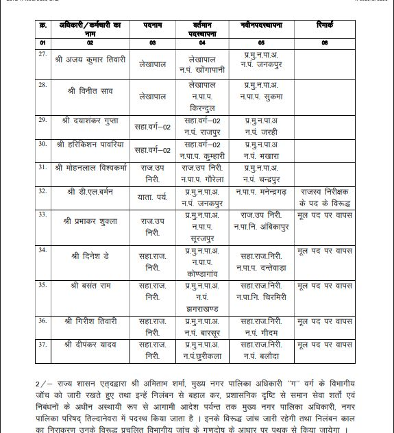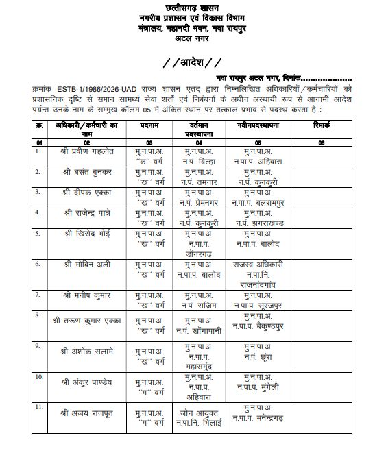 CG Transfer News: रायपुर। नगरीय प्रशासन एवं विकास विभाग ने बड़ा फेरबदल किया है। जारी आदेश में कुल 37 अधिकारियों और कर्मचारियों के तबादले किए गए हैं, जिनमें 20 मुख्य नगर पालिका अधिकारी (CMO) भी शामिल हैं।