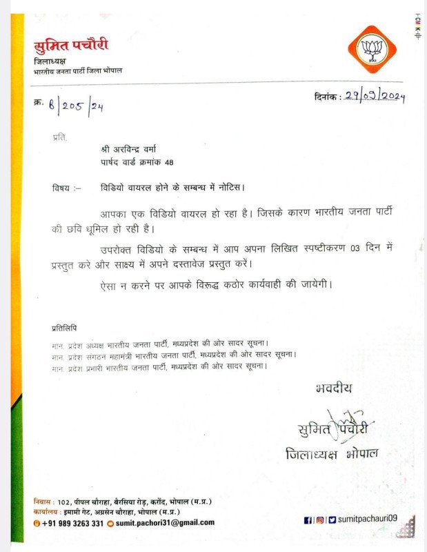 उन्होंने बताया कि उन्हें मीणा की ओर से भी शिकायत मिली है जिसमें आरोप लगाया गया है कि पार्षद उनसे जबरन पैसे वसूल रहे हैं।टीआई ने कहा, हम उनकी शिकायत की जांच कर रहे हैं और उसके अनुसार कार्रवाई करेंगे।वही भजपा के जिला अध्यक्ष सुमित पचौरी ने पार्षद को कारण बताओ नोटिस जारी कर दिया है।