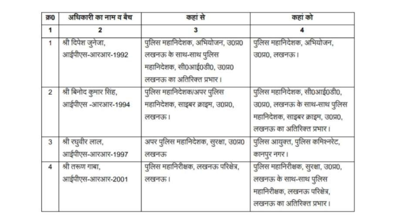IPS Transfer : लखनऊ। उत्तर प्रदेश सरकार ने चार IPS अफसरों के तबादले करते हुए नई जिम्मेदारियों का ऐलान किया है। जारी आदेश में दीपेश जुनेजा, विनोद कुमार सिंह, रघुवीर लाल और तरुण गाबा के नाम शामिल हैं। आदेश के मुताबिक 1997 बैच के आईपीएस अफसर और पुलिस महानिदेशक सुरक्षा के पद पर तैनात रघुवीर लाल को कानपुर पुलिस कमिश्नरेट का नया पुलिस आयुक्त बनाया गया है।