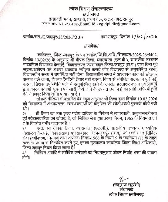 कलेक्टर रोहित व्यास की रिपोर्ट के बाद डीपीआई ऋतुराज रघुवंशी ने निलंबन आदेश जारी किया। आदेश के अनुसार, शासकीय उच्चतर माध्यमिक विद्यालय केरसई, विकासखंड फरसाबहार में पदस्थ व्याख्याता दीपक तिग्गा पर कई गंभीर आरोप पाए गए।