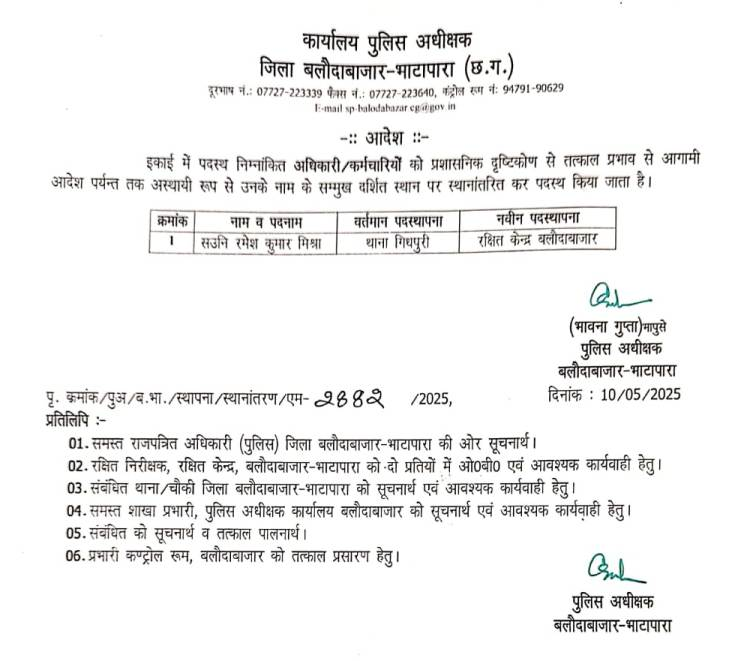 Line Attached : बता दें कि 9 मई 2025 को एसपी भावना गुप्ता के गिधपुरी थाना के आकस्मिक निरीक्षण के दौरान हुआ। निरीक्षण में एक संवेदनशील प्रकरण की समीक्षा के समय एएसआई रमेश मिश्रा द्वारा विवेचना में गंभीर खामियां पाई गईं। जब उनसे इस संबंध में स्पष्टीकरण मांगा गया, तो वे कोई संतोषजनक जवाब नहीं दे सके। प्रकरण की गंभीरता को देखते हुए एसपी ने त्वरित कार्रवाई करते हुए एएसआई मिश्रा को गिधपुरी थाना से हटाकर रक्षित केंद्र, बलौदाबाजार में स्थानांतरित कर दिया।