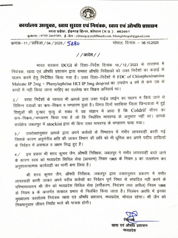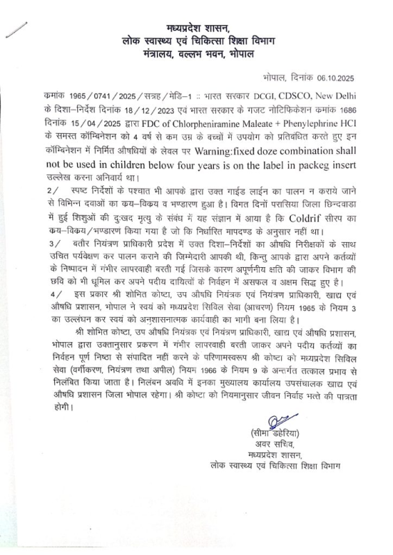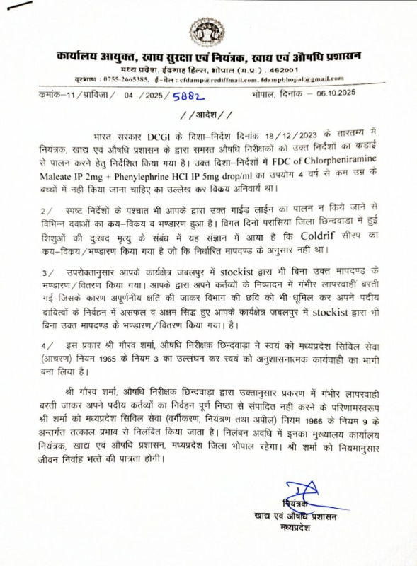 MP News : भोपाल। मध्य प्रदेश के छिंदवाड़ा में कोल्ड्रिफ कफ सिरप से बच्चों की मौत के मामले में मुख्यमंत्री डॉ. मोहन यादव ने सख्त कदम उठाए हैं। सीएम ने तीन वरिष्ठ अधिकारियों को तत्काल प्रभाव से निलंबित कर दिया और ड्रग कंट्रोलर दिनेश मौर्य को उनके पद से हटा दिया। खाद्य एवं औषधि प्रशासन ने इस संबंध में औपचारिक आदेश जारी कर दिए हैं।