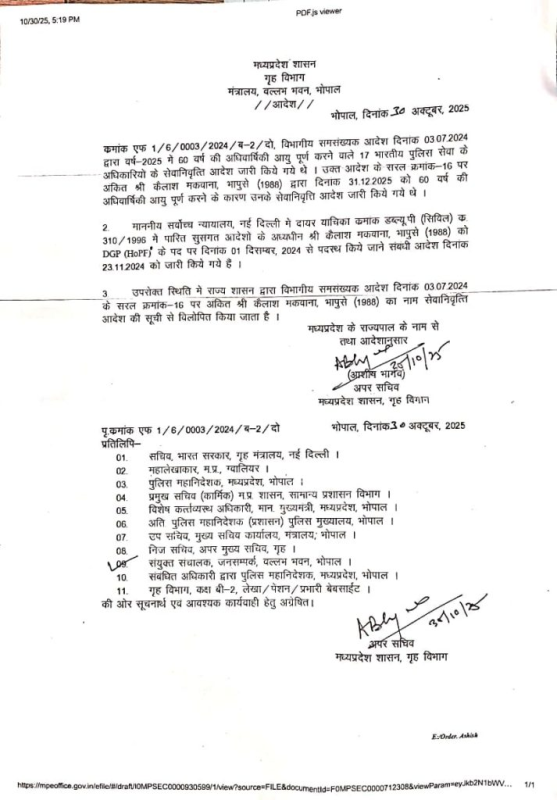 MP News : DGP कैलाश मकवाना का कार्यकाल बढ़ा,अब 2026 तक संभालेंगे प्रदेश की पुलिस कमान, गृह विभाग ने किया आदेश जारी