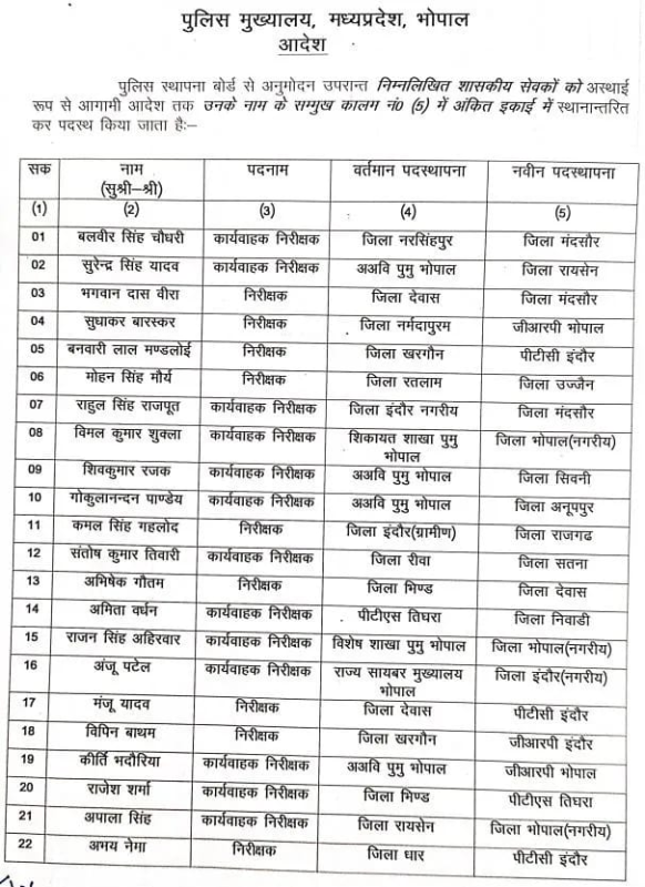 MP Police : अधिकारियों को निर्देश दिया गया है कि वे शीघ्र ही नई पोस्टिंग पर रिपोर्ट करें। पुलिस मुख्यालय ने स्पष्ट किया है कि यह तबादला पूरी तरह प्रशासनिक आधार पर किया गया है।