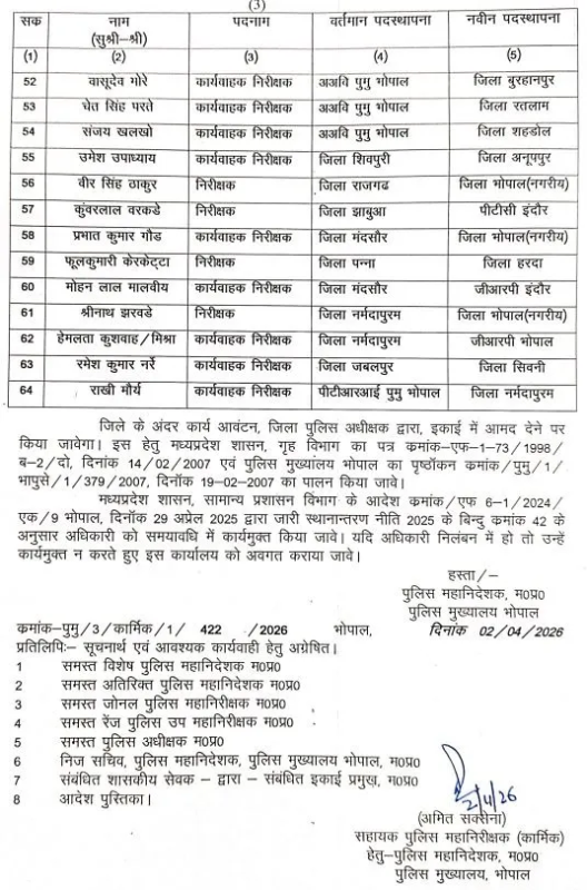 MP Police : भोपाल: मध्य प्रदेश पुलिस विभाग में इंस्पेक्टर रैंक के अधिकारियों के बड़े पैमाने पर तबादले कर दिए गए हैं। पुलिस मुख्यालय ने प्रशासनिक जरूरतों और बेहतर कार्य व्यवस्था को ध्यान में रखते हुए 64 इंस्पेक्टर्स को विभिन्न जिलों में पदस्थ करने के आदेश जारी किए हैं।