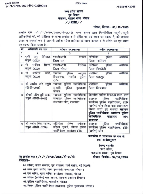 MP Police Transfer : 3 IPS और 3 राज्य पुलिस सेवा अधिकारियों को मिली नई जिम्मेदारी, देखें लिस्ट