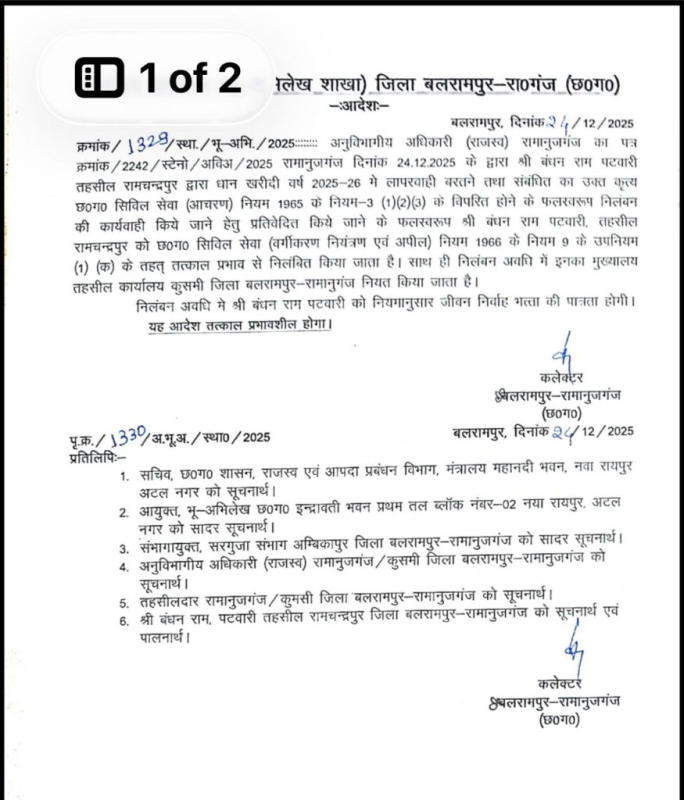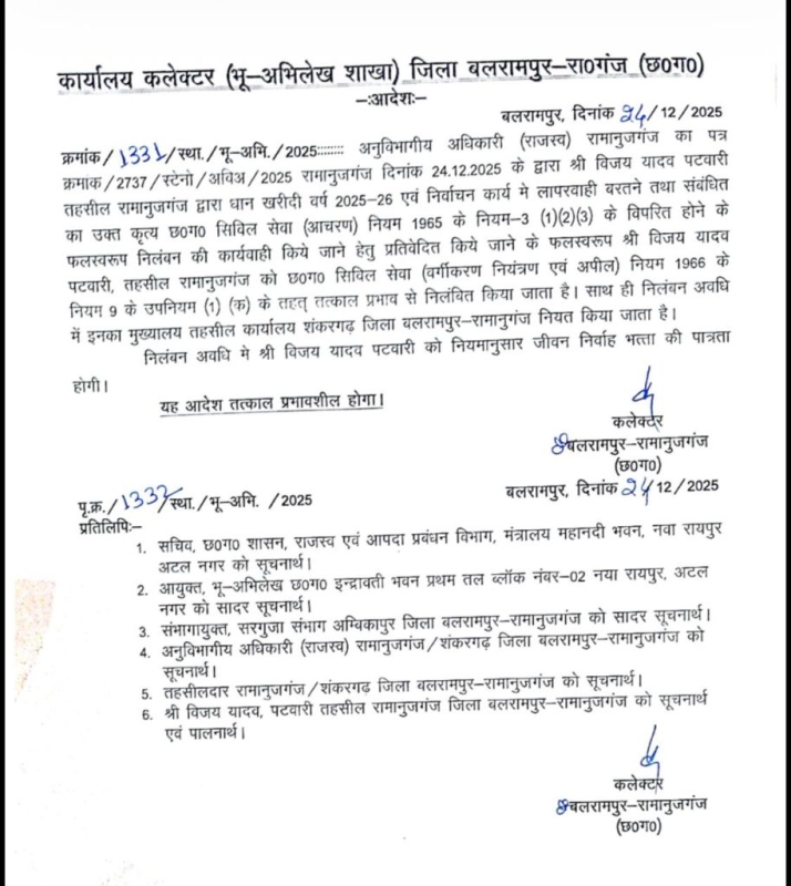 Patwari Suspended : बलरामपुर। धान खरीदी व्यवस्था में लापरवाही को लेकर बलरामपुर कलेक्टर ने सख्त कदम उठाया है। वर्ष 2025–26 की धान खरीदी के दौरान कर्तव्यों के निर्वहन में गंभीर अनियमितता पाए जाने पर दो पटवारियों को तत्काल प्रभाव से निलंबित कर दिया गया है। इस कार्रवाई से जिले के राजस्व अमले में हड़कंप मच गया है।