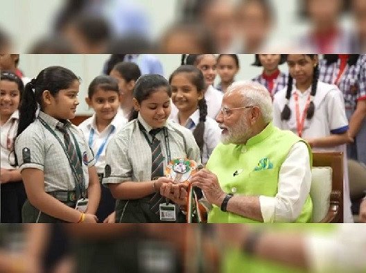 पीएम मोदी ने स्कूली बच्चों से साथ मनाया रक्षाबंधन, रंग-बिरंगी राखियों से सजीं प्रधानमंत्री की कलाई