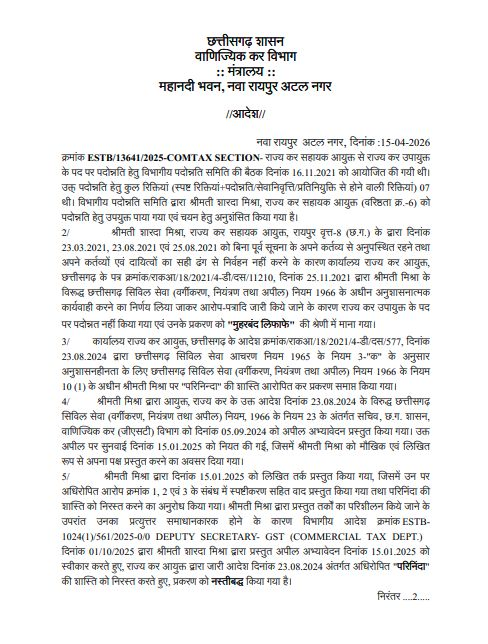 छत्तीसगढ़ के वाणिज्यिक कर (GST) विभाग में प्रशासनिक स्तर पर एक महत्वपूर्ण निर्णय लिया गया है।