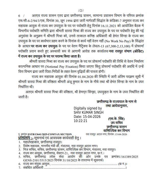 Promotion News : रायपुर। छत्तीसगढ़ के वाणिज्यिक कर (GST) विभाग में प्रशासनिक स्तर पर एक महत्वपूर्ण निर्णय लिया गया है। असिस्टेंट कमिश्नर शारदा मिश्रा को पदोन्नत कर डिप्टी कमिश्नर बनाया गया है। इस पदोन्नति के साथ ही उन्हें नया रायपुर (अटल नगर) संभाग-1 में ऑडिट कार्य की जिम्मेदारी सौंपी गई है।