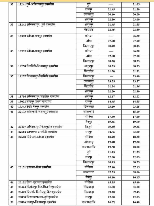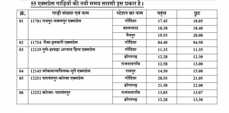 रेलवे प्रशासन के अनुसार, दक्षिण पूर्व मध्य रेलवे (SECR) जोन में कुल 55 ट्रेनों के आगमन और प्रस्थान समय में बदलाव किया गया है। यह परिवर्तन यात्रियों की सुविधा, ट्रेनों की समयपालन क्षमता और परिचालन सुधार को ध्यान में रखते हुए किए गए हैं। रेलवे ने यात्रियों से अपील की है कि वे यात्रा से पहले अपनी ट्रेन का अपडेटेड टाइम टेबल अवश्य जांच लें, ताकि किसी भी प्रकार की असुविधा से बचा जा सके।