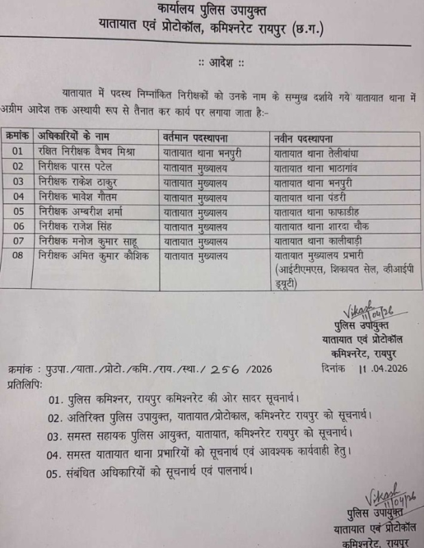 Raipur City News: रायपुर पुलिस कमिश्नरी के 8 यातायात प्रभारियों का तबादला, देखें लिस्ट