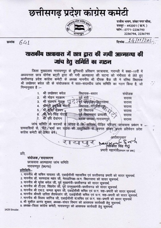 Raipur City News : छात्र आत्महत्या मामले में कांग्रेस ने गठित की 7 सदस्यीय समिति...