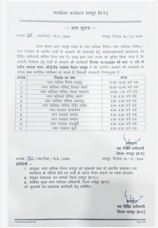 Raipur City News : 5 पालिका, 5 पंचायत और नगर निगम वार्डों के आरक्षण की तारीख तय, कलेक्टर ने जारी किया आदेश...