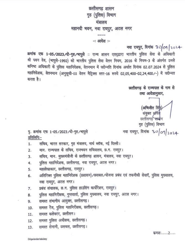 Raipur City News : पवन देव बने डीजी, तीन महीने के इंतजार के बाद गृह विभाग ने जारी किए प्रमोशन आदेश...