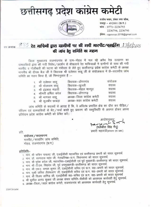 Raipur City News : रायपुर। राजनांदगांव जिले में अवैध रेत खनन के विरोध में ग्रामीणों पर रेत माफियाओं द्वारा किए गए हमले और गोलीबारी की घटना ने प्रदेश में सियासी हलचल मचा दी है। इस मामले की गंभीरता को देखते हुए कांग्रेस पार्टी ने 6 सदस्यीय जांच समिति का गठन किया है, जो घटना की विस्तृत जांच कर अपनी रिपोर्ट सौंपेगी। जांच समिति का नेतृत्व डोंगरगांव विधायक दलेश्वर साहू करेंगे। इसके अलावा विधायक भोलाराम साहू, इंद्रशाह मंडावी, हर्षिता बघेल, जिला कांग्रेस कमेटी के अध्यक्ष भागवत साहू और कुलबीर छाबड़ा भी कमेटी में शामिल हैं।