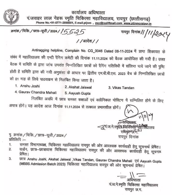 Raipur City News : एंटी रैगिंग कमेटी की सख्त कार्रवाई, मेडिकल कॉलेज के 5 छात्र सस्पेंड...