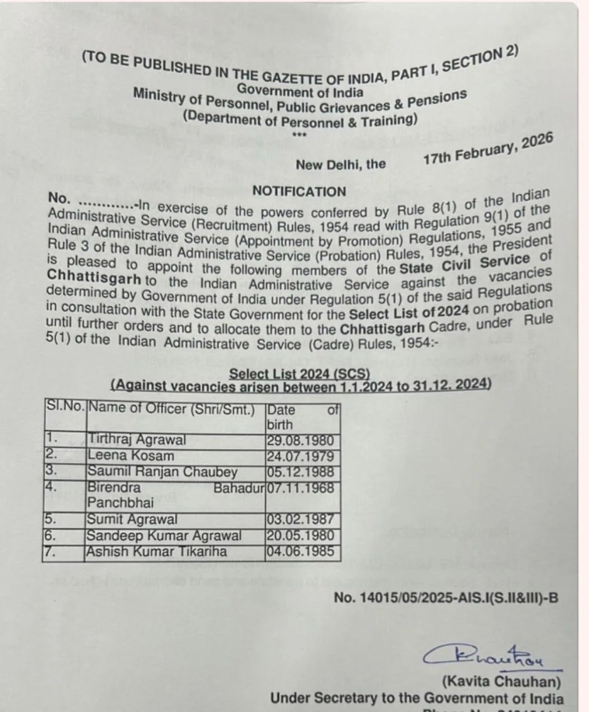 SCS Promoted IAS: रायपुर। छत्तीसगढ़ प्रशासनिक सेवा के अधिकारियों के लिए मंगलवार का दिन बड़ी खुशखबरी लेकर आया। डिपार्टमेंट ऑफ़ पर्सनल एंड ट्रेनिंग (DoPT) ने 17 फरवरी 2026 को एक औपचारिक अधिसूचना जारी करते हुए राज्य सिविल सेवा (SCS) के 7 सदस्यों को इंडियन एडमिनिस्ट्रेटिव सर्विस (IAS) में पदोन्नत कर दिया है। ये नियुक्तियां वर्ष 2024 की सेलेक्ट लिस्ट में रिक्त पदों के आधार पर की गई हैं।
