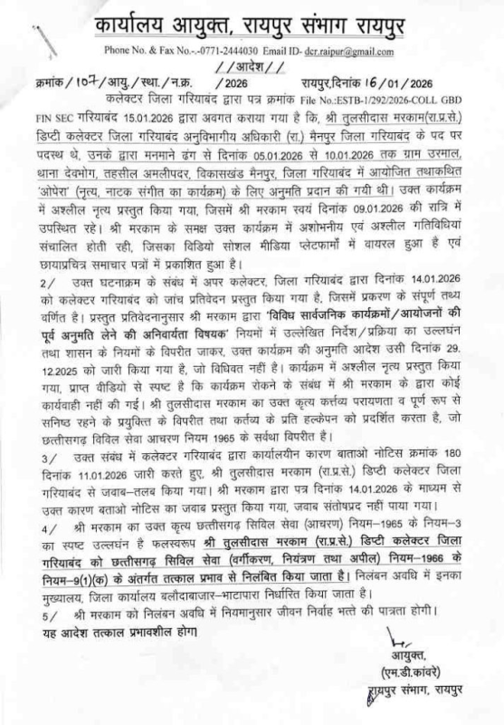 SDM Suspended : गरियाबंद। उरमाल गांव में हुए अश्लील डांस मामले ने आखिरकार प्रशासन को कठघरे में खड़ा कर दिया है। नियमों को ताक पर रखकर दिए गए आयोजन की अनुमति और खुद कार्यक्रम में मौजूद रहने की पुष्टि के बाद कमिश्नर महादेव कांवरे ने मैनपुर एसडीएम तुलसी दास मरकाम को निलंबित कर दिया है।