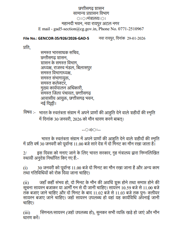 Shaheed Divas : रायपुर। भारत के स्वतंत्रता संग्राम में अपने प्राण न्योछावर करने वाले अमर शहीदों की स्मृति में 30 जनवरी को शहीद दिवस मनाया जाएगा। इस अवसर पर छत्तीसगढ़ शासन के सामान्य प्रशासन और गृह विभाग ने आदेश जारी कर प्रदेशवासियों से दो मिनट का मौन रखकर शहीदों को श्रद्धांजलि देने की अपील की है।