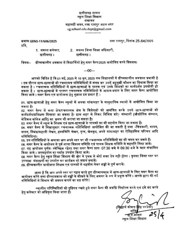 Summer Camp : रायपुर। छत्तीसगढ़ के स्कूल शिक्षा विभाग ने गर्मी की छुट्टियों में स्कूली छात्रों के लिए समर कैंप आयोजित करने के लिए नौ बिंदुओं वाली गाइडलाइन जारी की है। इसका उद्देश्य चित्रकारी, गायन, नृत्य, लेखन, खेलकूद और ऐतिहासिक भ्रमण जैसी रचनात्मक गतिविधियों के माध्यम से बच्चों का कौशल विकास करना है। शिक्षा सचिव ने सभी जिला कलेक्टरों और जिला शिक्षा अधिकारियों (डीईओ) को इस संबंध में निर्देश जारी किए हैं।