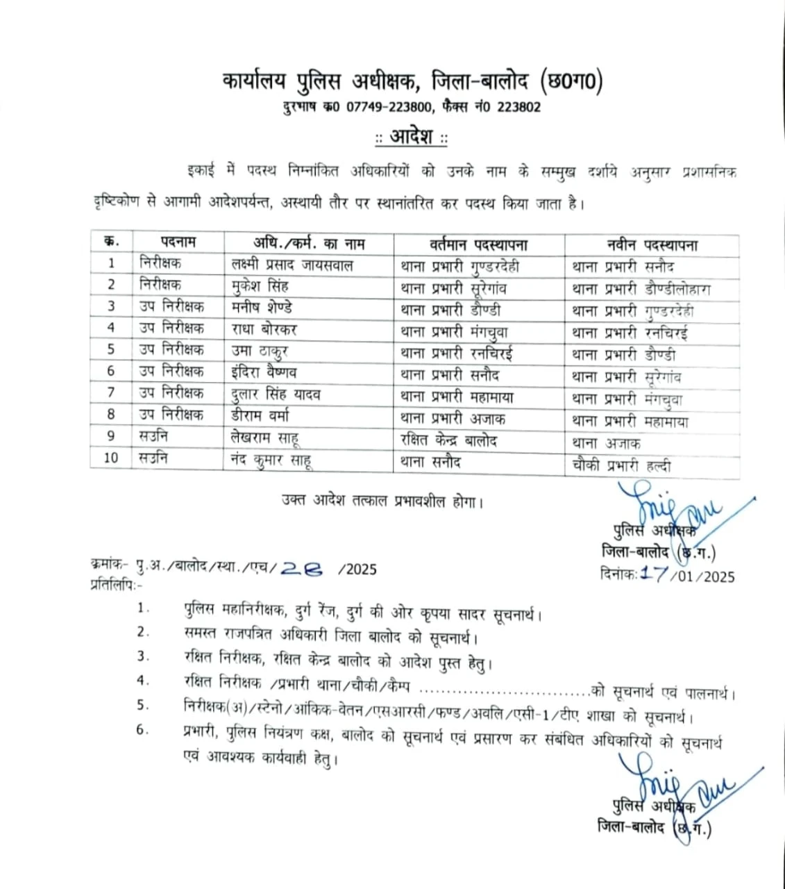 बालोद पुलिस विभाग में सर्जरी, कई पुलिसकर्मी हुए इधर से उधर