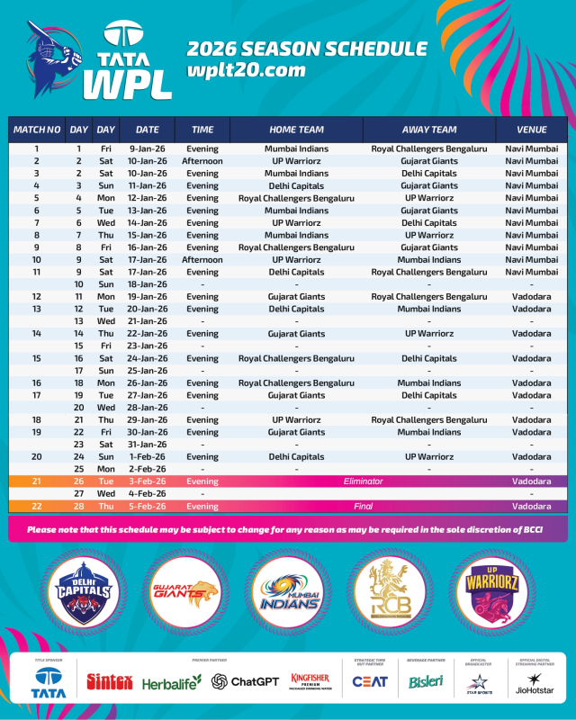 WPL 2026 Full Schedule: नई दिल्ली। भारतीय क्रिकेट कंट्रोल बोर्ड (बीसीसीआई) ने महिला प्रीमियर लीग (WPL) 2026 का शेड्यूल जारी कर दिया है। चौथा सीजन 9 जनवरी से 5 फरवरी 2026 तक खेला जाएगा। इस बार टूर्नामेंट दो चरणों में विभाजित है। पहला चरण 9 से 17 जनवरी तक नवी मुंबई में होगा, जबकि दूसरा चरण 19 जनवरी से वडोदरा में खेला जाएगा। फाइनल मुकाबला भी वडोदरा में ही आयोजित किया जाएगा।