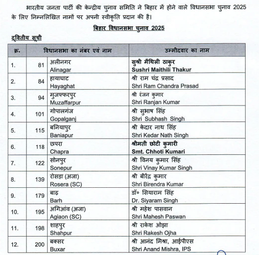 Bihar BJP candidate list पटना। बिहार विधानसभा चुनाव के लिए भारतीय जनता पार्टी ने बुधवार को दूसरी लिस्ट जारी कर दी है। इस लिस्ट में भाजपा ने कुल 12 उम्मीदवारों के नाम का ऐलान कर दिया है। जारी सूची में कथा वाचिका मैथिली ठाकुर को अलीनगर से उम्मीदवार बनाया गया है।