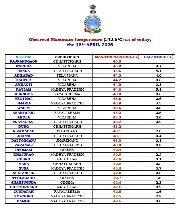 भारतीय मौसम विभाग (IMD) ने कई राज्यों में हीटवेव की चेतावनी जारी की है। 19 से 23 अप्रैल के बीच पूर्वी उत्तर प्रदेश, पूर्वी राजस्थान, मध्य प्रदेश, झारखंड, पंजाब और हरियाणा में लू चलने की संभावना है। वहीं पश्चिमी उत्तर प्रदेश और पश्चिमी राजस्थान में भी तेज गर्म हवाएं लोगों को परेशान कर सकती हैं। मौसम विभाग ने लोगों को दोपहर में बाहर निकलने से बचने, अधिक पानी पीने और हल्के कपड़े पहनने की सलाह दी है।