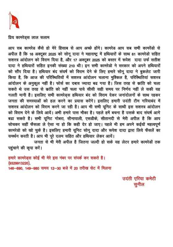 CG News: पत्र में कमेटी के सदस्य सुनील ने लिखा है कि मौजूदा परिस्थितियों और सुरक्षा बलों के लगातार बढ़ते दबाव के चलते अब सशस्त्र संघर्ष को आगे बढ़ाना संभव नहीं है। उन्होंने अपने साथियों से भी हथियार डालने और समाज की मुख्यधारा में शामिल होने की अपील की है। इसके साथ ही संपर्क के लिए एक मोबाइल नंबर भी साझा किया गया है, ताकि इच्छुक सदस्य आगे आकर आत्मसमर्पण कर सकें।