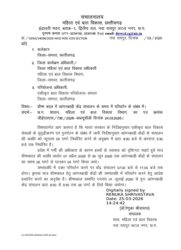 CG News : छत्तीसगढ़ में आंगनबाड़ी का समय घटा, अब सिर्फ 4 घंटे ही खुलेंगे केंद्र, आदेश जारी