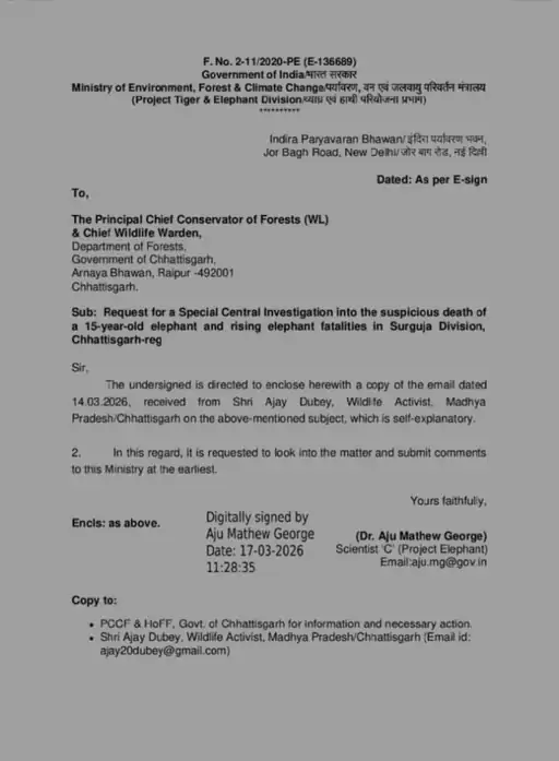 CG News: रायपुर: छत्तीसगढ़ के सूरजपुर जिले के करंजवार गांव में 13 मार्च को एक 15 वर्षीय हाथी की संदिग्ध मौत के मामले ने गंभीर रूप ले लिया है। इस घटना पर संज्ञान लेते हुए केंद्र सरकार के पर्यावरण, वन एवं जलवायु परिवर्तन मंत्रालय के प्रोजेक्ट एलीफेंट डिवीजन ने राज्य सरकार से विस्तृत रिपोर्ट मांगी है। यह कार्रवाई वन्यजीव कार्यकर्ता अजय दुबे की शिकायत के बाद की गई है। मंत्रालय ने प्रमुख मुख्य वन संरक्षक को पत्र जारी कर जल्द जांच रिपोर्ट प्रस्तुत करने के निर्देश दिए हैं।