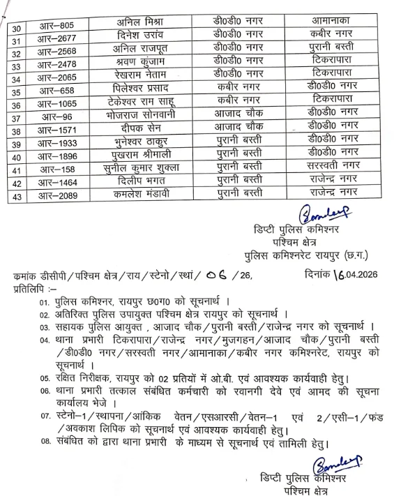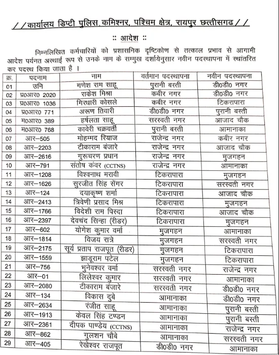 CG Police Transfer : रायपुर। रायपुर पुलिस विभाग में प्रशासनिक स्तर पर बड़ा बदलाव किया गया है। पश्चिम क्षेत्र के पुलिस उपायुक्त संदीप पटेल ने 43 पुलिसकर्मियों के तबादले का आदेश जारी किया है। इस फैसले के बाद महकमे में हलचल तेज हो गई है और नई तैनातियों को लेकर चर्चाओं का दौर शुरू हो गया है।
