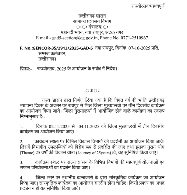 CG Rajyotsava 2025: छत्तीसगढ़ के सभी जिलों में 2 से 4 नवंबर तक राज्योत्सव,“25 वर्षों की विकास यात्रा” थीम पर होगी प्रदर्शनी